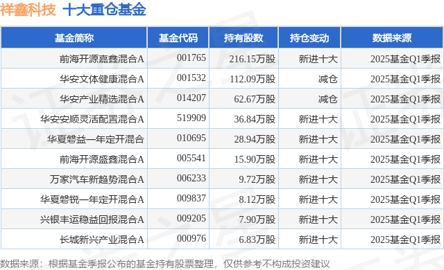 重仓祥鑫科技的前十大公募基金请见下表: